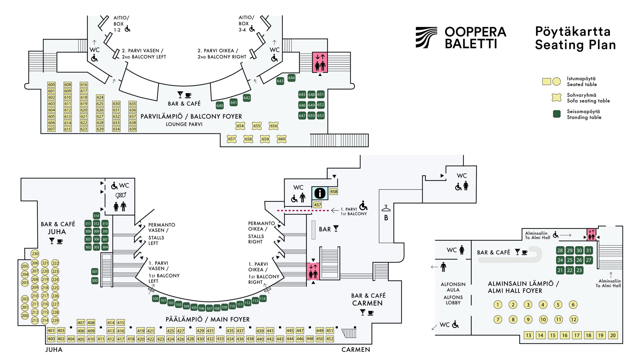 If you need to be assigned an accessible table, please email our customer services at least one week before the performance: ravintola.oopperabaletti[at]restel.fi.